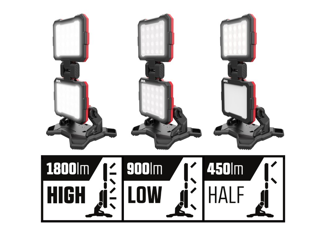 SKIL 3157 „20V Max“ (18 V) je výkonné akumulátorové dvojité pracovní světlo LED, které zajišťuje světlo při kutilské práci všude tam, kde potřebujete. Je vybaveno třístupňovým nastavením jasu pro ještě větší jas, kdykoli potřebujete, přičemž přepínání mezi těmito jednotlivými nastaveními je snadné. Tato svítilna produkuje jasné bílé světlo až do 1 800 lumenů, což je množství světla srovnatelné s výkonem klasické 100W žárovky. Ve srovnání s klasickou žárovkou je SKIL 3157 energeticky úsporné a šetrnější k životnímu prostředí. Pro ještě větší pohodlí při práci můžete snadno každou světelnou hlavici nastavit do jiné polohy a namířit kužel světla požadovaným směrem. Další možností je zavěšení dvojitého pracovní světla LED na zabudovaný kovový háček. Díky těmto praktickým funkcím budete mít obě ruce volné na samotnou práci. Světlo se automaticky zhasne, když se obě světelné hlavice sklopí. SKIL 3157 CA se dodává bez akumulátoru.