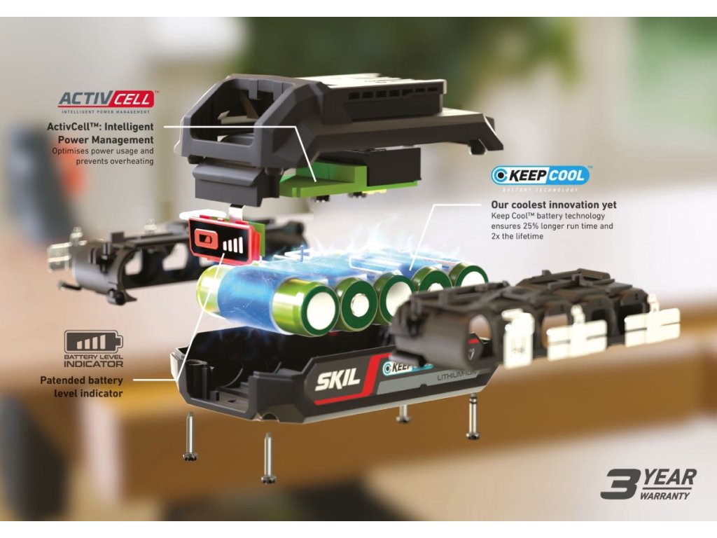Součástí „Energy Platform“ SKIL: systém flexibilních akumulátorů. Akumulátorová technologie „Keep Cool™“ zajišťuje o 25 % delší dobu chodu a 2× delší životnost. Naše patentovaná technologie „ActivCell™“ zaručuje optimalizaci využití energie, zabraňuje přehřátí a maximalizuje výkonnost akumulátoru. Patentovaný praktický indikátor informuje o úrovni nabití akumulátoru.